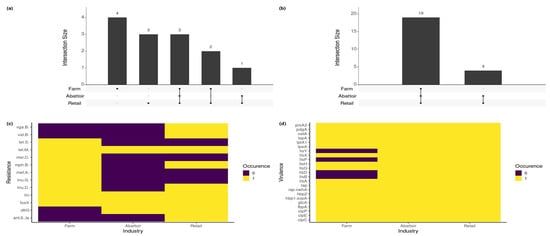 Resistance and virulence profiles across the three different industries. (a) Unique and shared resistance genes in the farm, abattoir, and retail industries. In farming environments, four unique AMR genes (lnuG, mefA, msrD, tetS) were present, compared with three (ant.6.Ia, vatB, vgaB) in the retail sector. These are represented by a black dot below the bar, with the number in the set on top of the bar. Three AMR genes (fosX, lin, tetM) were found in all three environments. (b) Shared virulence genes found in the three different industries. The three sectors shared a total of 19 virulence genes, with four (llsB, llsD, llsP, llsY) found exclusively in the abattoir and retail industries. (c,d) Presence/absence plots for the genes found in the three industries. Purple represents the absent, and yellow represents the present.