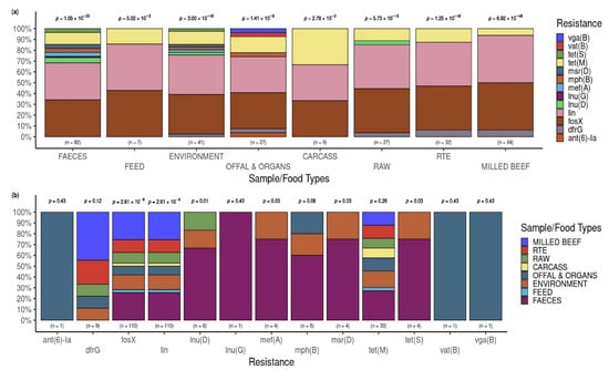 Occurrence of resistance genes according to the food and sample types. (a) Distribution of resistance genes across the food and sample types. The p-value associated with a proportion test within each food and sample type is indicated above the respective bar. (b) The food and sample types associated with each resistance gene detected. The p-values above each individual bar was obtained by proportion testing of the food and sample types associated with each resistance gene.