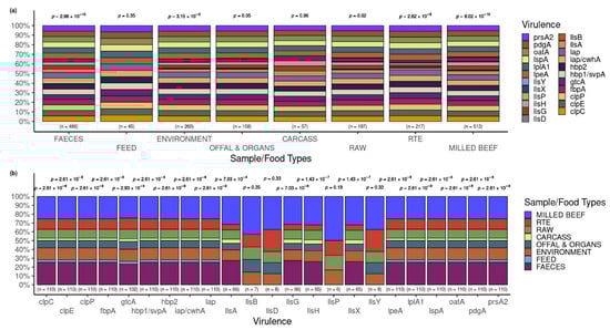 The p-values above the bars indicate a significant difference from the expected proportions for the resistance genes found within each food/sample type. The frequencies of AMR genes in L. innocua varied significantly (p < 0.05) for each of the eight sample/food types assessed (Figure 6a).