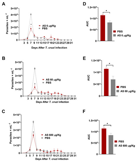 T. cruzi infection course and response to AS therapy. C57BL/6 mice were infected with 5 × 103 trypomastigotes of T. cruzi. Daily treatment with AS (6–600 µg/kg/mouse) was initiated 15 min after infection and continued for 12 days. Control T. cruzi-infected mice received PBS (n = 8). The mean ± SEM values shown are representative of three independent experiments, and significant differences in parasitemia were observed (* p = 0.0067, Friedman test). (A) treatment with AS at doses of 6 ug/kg (n = 6), (B) 60 ug/kg (n = 8), and (C) 600 ug/kg (n = 7). Overall, parasitemia was also represented as the area under the curve (AUC) analysis. Significance was determined as * p = 0.0025 (D), * p = 0.00190 (E), and * p = 0.0091 (F), applying the unpaired t test.
