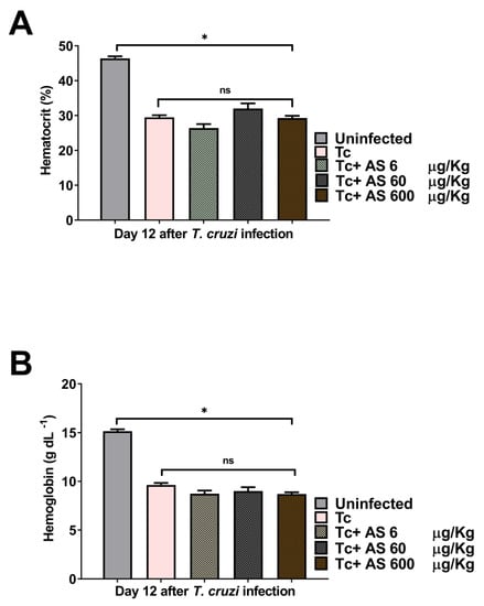 The effect of AS on anemia in T. cruzi-infected mice. On the 12th day post-infection, (A) hematocrit and (B) hemoglobin were evaluated. C57BL/6 mice were divided into groups of five and infected with 5 × 103 T. cruzi, treated or not with AS (6–600 µg/kg/mouse). Control T. cruzi-infected mice (Tc group) received PBS. The mean ± SEM values shown are representative of three independent experiments, and significant differences were observed between uninfected and infected groups. * p ≤ 0.05, two-way ANOVA with Tukey post-test, ns = non significance.