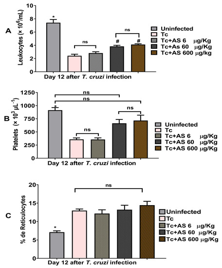 AS treatment mitigates leukopenia and thrombocytopenia observed during the acute phase of T. cruzi infection (day 12 p.i). For this investigation, C57BL/6 mice were divided into groups of five and infected with 5 × 103 T. cruzi, treated or not with AS (6–600 µg/kg/mouse). The control group consisted of T. cruzi-infected mice (Tc group) receiving PBS. The mean ± SEM values shown in the figures are representative of three independent experiments. (A) Leukocytes, * p ≤ 0.05, two-way ANOVA with Tukey post-test (* uninfected vs. experimental groups), (# infected groups treated with AS 60 and 600 µg/kg/mouse group vs. uninfected group and vs. infected group treated with AS 6 µg/kg/mouse group). (B) Platelet levels and (C) reticulocyte counts, * p ≤ 0.05, two-way ANOVA with Tukey post-test (* uninfected vs. experimental groups), ns = non significance.
