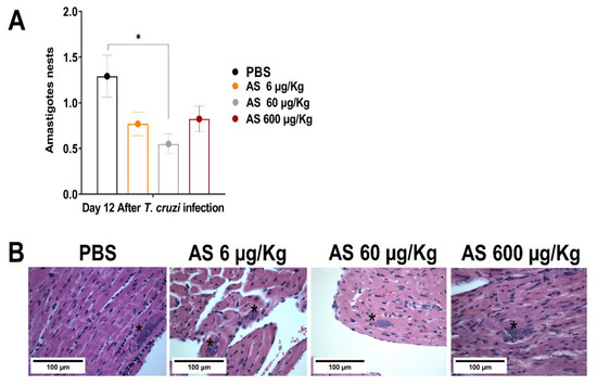 Effect of AS on heart parasitism. C57BL/6 mice were divided into groups of three to five individuals, and they were infected with 5 × 103 T. cruzi, treated or not with AS (6–600 µg/kg/mouse). Control T. cruzi-infected mice received PBS. Animals were euthanized 12 days after infection, and sections of the heart from each mouse were collected for histopathological analysis. Tissue fragments were fixed in a 10% buffered formalin solution, dehydrated, cleared, and embedded in paraffin. Chilly tissue samples were sliced into 5 mm thick sections and stained with hematoxylin and eosin (H&E) to assess amastigote nests. (A) Tissue parasitism was scored by counting the total number of amastigote nests in 25 microscope fields (1 × 400 magnification) per histopathological section. The mean ± SEM values shown are representative of two independent experiments, * p ≤ 0.05, two-way ANOVA with Tukey post-test (* control vs. experimental groups). (B) Representative photomicrograph of cardiac tissue from control and experimental groups. * Shows amastigote nest.
