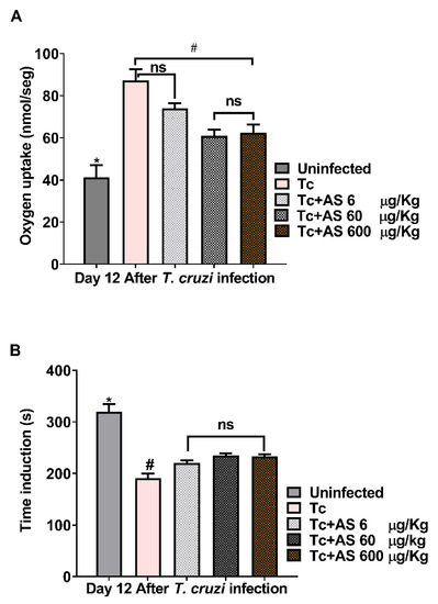 AS attenuates erythrocyte oxidative stress on day 12 after T. cruzi infection. (A) Oxygen uptake and (B) induction time. Groups of C57BL/6 mice (n = 5/group) were infected with 5 × 103 T. cruzi and subsequently treated or not with AS (6–600 µg/kg/mouse). As a control, T. cruzi-infected mice (Tc group) received PBS. The mean ± SEM values shown are representative of two independent experiments, * p ≤ 0.05, two-way ANOVA with Tukey post-test (* uninfected vs. experimental groups), # p ≤ 0.05, two-way ANOVA with Tukey post-test (* control vs. experimental groups). ns = not significant.