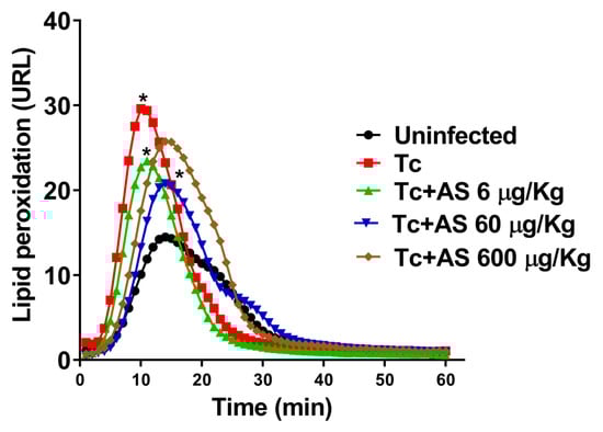 Time course curve of t-butyl hydroperoxide-initiated chemiluminescence in erythrocytes. Groups of C57BL/6 mice (n = 5/group) were infected with 5 × 103 T. cruzi and either treated or not treated with AS (6–600 µg/kg/mouse). Uninfected mice and untreated T. cruzi-infected mice (Tc group) were included as controls. The values presented are the mean ± SEM and represent two independent experiments. Significance was determined as * p ≤ 0.05, using Kruskal–Wallis’s test, indicating a significant difference from the values observed in the controls (uninfected/infected-non-treated group or infected/non-treated group/infected treated group).