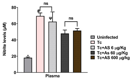 Effect of AS therapy on nitrite levels in the plasma (day 12 p.i). C57BL/6 mice were divided into groups and infected with 5 × 103 T. cruzi, treated or not with AS (6–600 µg/kg/mouse). T. cruzi-infected mice (Tc group, n = 10) and uninfected mice received PBS (n = 9) and were used as controls. The mean ± SEM values shown are representative of two independent experiments, * p ≤ 0.05, two-way ANOVA with Tukey post-test (* uninfected vs. experimental groups), # p ≤ 0.05, two-way ANOVA with Tukey post-test (Tc vs. uninfected group and Tc vs. Tc 60 µg/kg), Ψ p ≤ 0.05, two-way ANOVA with Tukey post-test (Tc + 6 µg/kg vs. Tc 60 µg/kg and Tc + 6 µg/kg vs. Tc 600 µg/kg). Tc + 6 µg/kg (n = 5); Tc 60 µg/kg (n = 7); and Tc 600 µg/kg (n = 9). ns = non-significant.