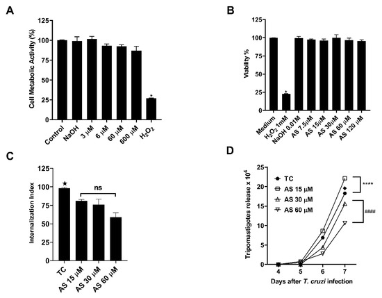 AS mediates T. cruzi infection in macrophages. (A) Cellular metabolic activity by reducing resazurin in T. cruzi trypomastigotes. (B) Cell viability in macrophages treated with AS (7.5–120 µM) by MTT assay. Controls consisting of H2O2 (1 mM) and NaOH (0.01 mM). (C) Internalization index of the interaction process between macrophages, treated with AS (15–60 µM) for 1 h and exposed to T. cruzi (5:1). (D) The effect of AS on trypomastigote release in T. cruzi-infected macrophages. Cells were infected with T. cruzi trypomastigotes and treated daily or not with AS. The release of trypomastigotes into the supernatant was detected and measured from day 4 to day 7 after infection. Values represent the mean ± SEM for triplicate determination and are representative of two independent experiments. * p ≤ 0.05, two-way ANOVA with Tukey post-test (H2O2 vs. experimental groups), ★ p ≤ 0.05, two-way ANOVA with Tukey post-test (Tc vs. experimental groups), ♦ p ≤ 0.0001, two-way ANOVA with Tukey post-test (Tc vs. experimental groups), **** p ≤ 0.0001, two-way ANOVA with Tukey post-test (Tc vs. AS 15µM), #### p ≤ 0.0001, two-way ANOVA with Tukey post-test (AS 30 µM vs. AS 60 µM). ns = non-significant.