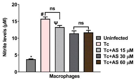 Effect of AS on nitric oxide (NO) production. Production of NO by macrophages was determined by measuring the level of accumulated nitrite, a metabolite of NO, in the culture supernatant using Griess reagent. Values are the mean ± SEM and are representative of two independent experiments. * p ≤ 0.05, two-way ANOVA with Tukey post-test (* uninfected vs. experimental groups), # p ≤ 0.05, two-way ANOVA with Tukey post-test (control vs. experimental groups), Ψ p ≤ 0.05, two-way ANOVA with Tukey post-test (Tc + 15µM vs. Tc 30 µM and Tc + 15 µM vs. Tc 60 µM). ns = non-significant.