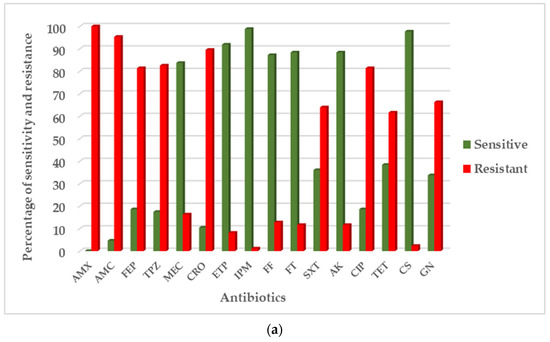 (a) Antibiotic resistance profile of enterobacteria in Ziguinchor. (b) Antibiotic resistance profile of enterobacteria in Dakar. AMX = amoxicillin, AMC = amoxicillin/clavulanic acid, FEP = cefepime, TPZ = piperacillin/tazobactam, MEC = mecillinam, CRO = ceftriaxone, ETP = ertapenem, IPM = imipenem, FF = fosfomycin, FT = furan, SXT = trimethoprim/sulfamethoxazole, AK = amikacin, CIP = ciprofloxacin, TET = tetracycline, CS = colistin, and GN = gentamicin.