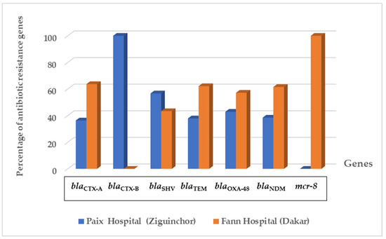 The objective of this study was to update the epidemiology of class A beta-lactamases, carbapenemases, and plasmid-mediated colistin resistance in enterobacterales in two remote regions of Senegal: Dakar (west of Senegal) and Ziguinchor (south of Senegal). To do so, we performed a phenotypic and molecular study of antibiotic resistance and determined the genes associated with this resistance.