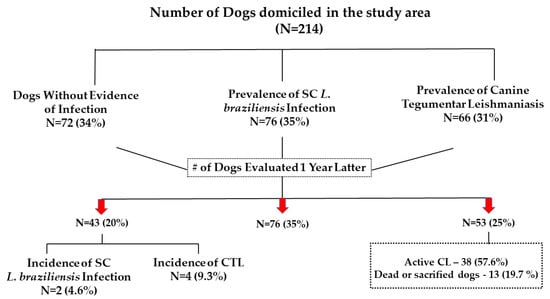 The finding of CTL or the SC L. braziliensis infection in regions where human ATL cases also occur supports to the idea that dogs play a role in the transmission cycle of ATL []. In fact, we have recently shown the presence of both symptomatic and SC L. braziliensis infection in dogs in a highly endemic area for human ATL []. However, the infection of dogs by L. braziliensis and CTL occurrence has been poorly investigated. Understanding that dogs are an important reservoir of L. braziliensis, as observed in VL caused by L. infantum, creates the possibility of evaluating in the future the impact of the control of CTL caused by L. braziliensis in the occurrence of ATL. The objective of the present study was to determine the incidence and prevalence of CTL caused by L. braziliensis and to evaluate the occurrence of human CL in homes with or without dogs with CTL or SC L. braziliensis infection.