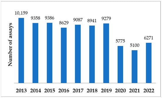 The methods used in Department of Microbiology were in accordance with the methodology in force in mycobacteria laboratories in Poland [23]. During 10-year study period, there were 81,985 specimens submitted for mycobacterial culture. The annual numbers of assays are shown in Figure 1. It shows a similar number of assays until 2019 and a significant decrease from 2020 to 2022 during the COVID-19 pandemic.