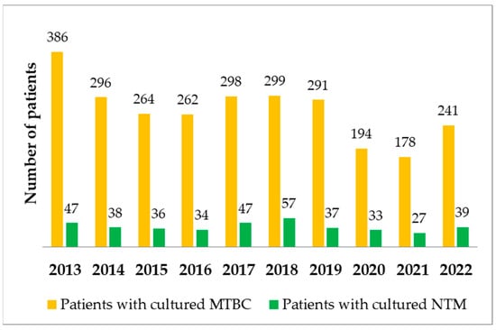 Over the 10 years, there were 3104 patients with mycobacteria strains. These included 2709 patients with MTBC strains (87.3% of all patients) and 395 with NTM strains (12.7%). A decrease in number of patients with cultured MTBC was observed from 386 in 2013 to 241 in 2022. The number of patients with cultured NTM remained similar with a peak in 2018 (n = 57). The proportion of patients with MTBC and NTM strains was compared (annual percentage changes). A slight upward trend of patients with cultured NTM among all patients with mycobacteria was noted. The numbers of patients with MTBC and NTM strains are shown year by year in Figure 2.