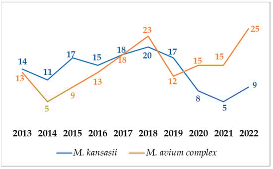 There were 148 MAC strains, including M. avium, M. intracellulare, and M. chimaera. Numbers of MAC and M. kansasii during the 10-year analysis period were compared. M. kansasii was the most commonly cultured NTM until 2017. A decrease in its cultivation was observed from 2019 to 2022. M. avium complex was the most commonly cultured NTM since 2018. Numbers of MAC and M. kansasii strains are shown year by year in Figure 3.