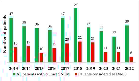 Numbers of patients with NTM-LD among all patients with cultured NTM during the 10-year analysis period.