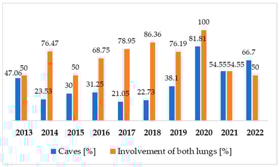 For the eight years of the research involvement of both lungs was more common than the presence of the caves. This proportion changed in 2021, and the next year caves were a more common radiological image of mycobacteriosis (Figure 5). It should be observed whether this proportion will be maintained or become more pronounced in the coming years, or whether the ratio will approach the situation from previous years.