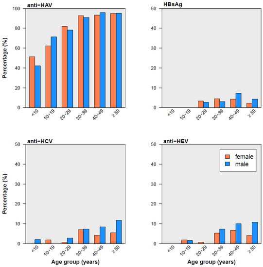 Seroprevalence of four viral hepatitides by sex and age groups. Anti-HAV, anti-HCV, and anti-HEV are antibodies against HAV, HCV, and HEV, respectively; HBsAg is hepatitis B surface antigen. The sex- and age-distribution of anti-HDV positive participants is not presented due to the low number (n = 6).