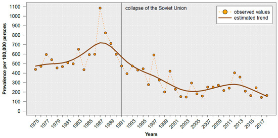 Prevalence of notified acute viral hepatitis in Kyrgyzstan, 1975–2018. Data source: Kyrgyz Ministry of Health [15]. The trend was fitted with a cubic smoothing spline.