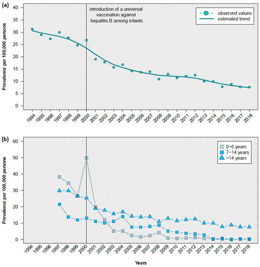 Since 1988, the prevalence has begun to decrease. Hepatitis B prevalence displayed a decreasing trend over the period of 1994 to 2018 (Figure 3a). The decrease was observed in all age groups, including children, adolescents, and adults, but was most prominent among 0- to 6-year-old children (Figure 3b).