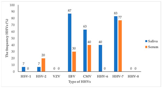 The Mann–Whitney test was performed to analyze whether there were differences in the presence of HHV members in the sera and saliva. Table 2 shows that there was no significant difference between several types of HHV members, including HSV-1, HSV-2, VZV, CMV, HHV-7, and HHV-8 (p > 0.05).