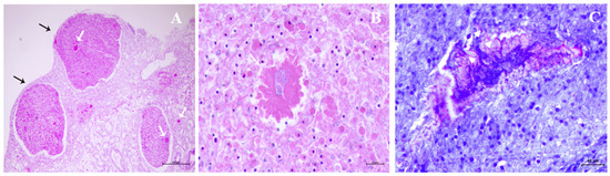 In the diseased mussels, macroscopic tissue damage caused by N. crassostreae was characterized by scattered nodules prevalent at the gill and mantle levels (Figure 1A,B). Microscopic findings of nodular proliferation were characterized by the presence of Nocardia colonies delimited by partly degenerated hemocytes, the immune-effector cells of mollusks. These nodules shared some resemblance with purulent collections from higher vertebrates (Figure 2A,B). In these individual samples, N. crassostreae DNA ranged from 0.3 to 1.06 copies/μL by ddPCR.