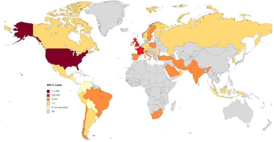 The incidence rates of MIS-C exhibit variation across different geographic regions. Higher numbers of cases have been reported in Europe, the Americas, Africa, South Asia, and the Middle East, while there is a scarcity of reported cases in East Asian countries. It is likely that environmental factors and social determinants of health disparities, in addition to genetic background, contribute to this geographic distribution of MIS-C incidence [13] (Figure 1).