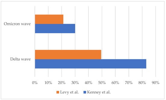 Recher et al., evaluating the risk of admission to the ICU for SARS-CoV-2 Delta and Omicron infections, concluded that the incidence of acute COVID-19 and MIS-C patients admitted to the pediatric ICU were significantly higher with the Delta variant than with the Omicron variant [25] (Figure 3).