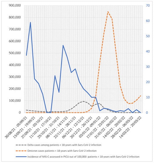 Incidence of MIS-C patients admitted to PICU in relation to Delta and Omicron cases in pediatric positive tested subjects [25]. The values on the y axis on the left indicate the number of SARS-CoV-2 cases < 18 years and represent the units of the dashed lines. The values on the y axis on the right refer to the incidence of MIS-C cases admitted to PICU and represent the units of the continuous line.