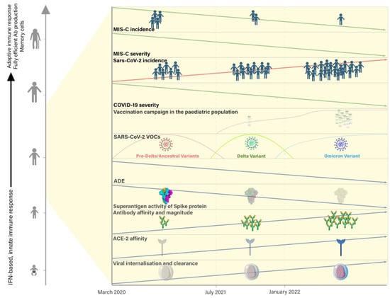 A combination of factors can be responsible for reduction in MIS-C severity and incidence through time, and more particularly between the Delta and Omicron wave: maturation of an immunological memory to SARS-CoV-2 over time, the implication of mutations of key amino acids of S protein in VOCs, the overall immune response elicited by vaccination over the loss of neutralization of vaccines to VOCs. These all play an important role in this change. However, it is difficult to precisely quantify each factor’s role. First, only a few papers describe MIS-C and the virus variants. Second, the immune state of MIS-C patients is nowadays heterogeneous: it is difficult, indeed, to distinguish the cases of MIS-C in patients with primary infection from those due to SARS-CoV2 reinfection and from those occurring in vaccinated subjects who were subsequently infected. Evidence suggests that each of the factors described may potentially bring a drop of MIS-C incidence and virulence, despite the increase in SARS-CoV-2 cases in the pediatric population, which have drastically raised after the relaxation of social measures. Concerning the risk of severe COVID-19 and MIS-C during the spread of Omicron, rare innate immune defects have been identified as a predisposing factor for MIS-C, enhancing the importance of the early mechanism of viral containment. Notably, there are other common factors that influence the functionality of innate immunity (e.g., epigenetic factors, HLA loci, the association of common variants of crucial genes, autoantibodies against IFN, inborn error of immunity) that may play a peculiar role in severe COVID-19 and MIS-C and in the rest of the population.