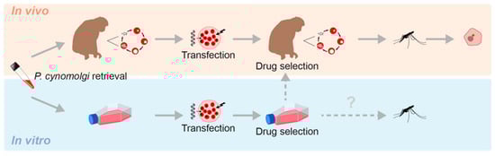 Genetic engineering platforms have been developed for a range of Plasmodium species [28,29,35,36,37,38,39]. Stable transfection of malaria parasites traditionally relies on a source of blood stage parasite material for the introduction of DNA, a procedure for introducing the DNA and a method to select for parasites that have taken up the DNA. Depending on the parasite species, this can be accomplished in vitro (P. falciparum) [29], in vivo (P. vivax) [40,41] and the rodent malarias P. berghei, P. yoelii, P. chabaudi [28,36,38] or both (the NHP parasites P. knowlesi [42] and P. cynomolgi [37,43]) (Figure 1). Besides differences in in vitro/in vivo dependence, the level of advancement of developed tools differs between species. At the same time, species-specific biological differences may complicate the extrapolation of findings to other species. For example, between species clear differences exist in gametocyte biology, not only at the level of morphology, maturation rate and longevity, but also in the genes involved in gametocyte development [44].