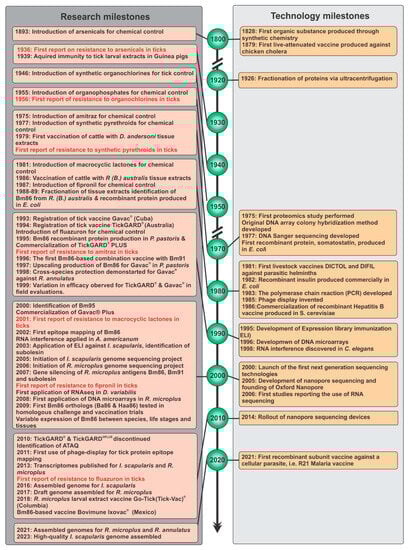 Discovery and development timeline for advancement of tick vaccine development according to date of first research publication. Highlighted are some research and technology milestones from the 1800s to the present. Acaricide resistance development of ticks to different acaricide classes are indicted in red. Additional information is supplied in Supplementary Table S1.