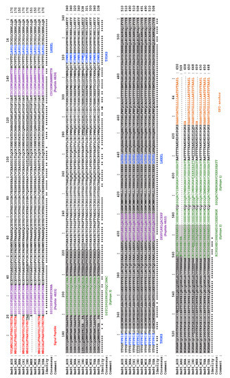 Multiple sequence alignments showing the antigenic regions (predicted and/or tested) of the Bm86 antigen isolated from Rhipicephalus (B.) australis (Yeerongpilly) and other geographical strains of R. microplus. Indicated is a standard multiple sequence alignment performed with Muscle (EMBL-EBI, https://www.ebi.ac.uk/Tools/msa/muscle/ accessed 10 June 2023), using the Bm86 sequence(s) available on the GenBank protein database (https://www.ncbi.nlm.nih.gov/protein/ accessed 10 June 2023) for the: Australian (AUS) TickGARD® antigen (Yeerongpilly strain, accession #: AAA30098), Argentinian (ARG) antigen used in Gavac® Plus (A strain, ‘Bm95′, accession #: AAD38381), Brazilian (Campo Grande strain, accession #: ACA57829), Chinese (CHI) (XJNJ strain, accession #: CHQBQ88489) Indian (IND) (IVRI-I strain, accession #: QFR98312), Mozambique (MOZ) (IVRI-I strain, accession #: ACZ55133), Mexico (MEX) (susceptible strain, accession #: ACR19243), Thailand (THI) (M1 strain, accession #: AJE29925), and the United States (USA) (Hidalgo 1 strain, accession #: ADQ19687). Identical amino acids that are shared between all sequences are indicated by asterisk (*) below the alignment. The predicted N- and C-terminal signal peptide(s) and GPI-anchor(s) are indicated in red and orange, respectively. Regions highlighted in grey correspond to “clone 3” and “clone 5” of E. coli producing truncated segments of the N- (Pos. 31- 223) and C-terminal (Pos. 351- 559) of Bm86, respectively, by Tellam et al. [49]. When tested in cattle infestation trials, the clone 3 truncation afforded a 53% reduction in female reproductive potential, and 65% was achieved for clone 5 [49]. Three peptide sequences (purple) were predicted by Patarroyo et al. [84] (i.e., 4822, 4823, and 4824), and synthetic peptides were produced, of which SBm7462®, consisting of all three peptides (in this order: 4822-4824-4823), produced between 72.4% and 81.05% vaccine efficacy. Additional potential epitopes were predicted by Blecha et al. [106] (green) and Parthasarathi et al. [107] (Underlined in the Indian Bm89 sequence), as well as two shared linear B cell epitopes (underlined in the Australian Bm86 sequence) between R. microplus and R. decoloratus predicted by Odongo et al. [105]. Indicated in dark blue are mimotope regions that were identified using consensus sequences determined by Prudencio et al. [108].