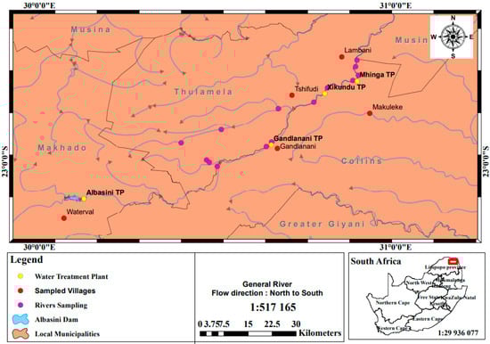 Within the Collins Chabane (CC) local municipality, the study focused on two villages, identified as Gandlanani and Makuleke. Gandlanani village receives its water supply from the Gandlanani Water Treatment Works, situated in the village, which draws its raw water from the Luvuvhu River, flowing through the village. On the other hand, Makuleke village relies on two treatment plants for its water supply, Xikundu Water Treatment Works and the Mhinga Water Treatment Works, depending on their operational status. The Xikundu Water Treatment Works, located in Xikundu village, draws its raw water from the Luvuvhu River passing through that area, while the Mhinga Water Treatment Works, situated in Mhinga village, also draws water from the Luvuvhu River.