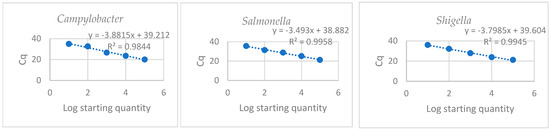Using the standard curves, the efficiency of the PCR and limit of detection (LOD) for each assay were determined. Further, the lower limit of quantification (LLOQ) and cut-off values for each assay were also determined. The efficiency of the different PCR assays was found to be 81% for Campylobacter jejuni subsp. jejuni, 83% for Shigella flexneri, and 93% for Salmonella enterica subsp. enterica serovar Typhimurium str. LT2. The LLOQ was determined by calculating the average Ct values from the standard curve (Figure 2) for each assay and they ranged from 27.5% to 28.58%, as shown in Table 4. The y-intercept was used as the cut-off value for each assay; any sample that amplified below the LLOQ/LOD and above the cut-off value was regarded as negative. Table 4 and Figure 2 below shows the parameters of the qPCR assays used for the detection of the target enteric pathogens.