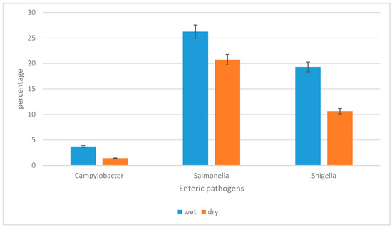 The prevalence of Campylobacter jejuni subsp. jejuni, Shigella flexneri, and Salmonella enterica subsp. enterica serovar Typhimurium str. LT2 during wet and dry seasons.