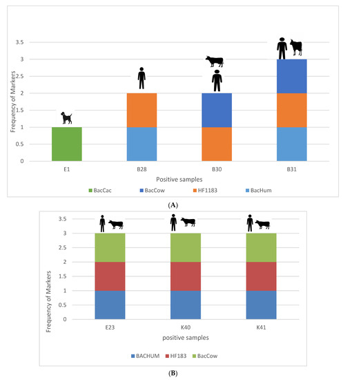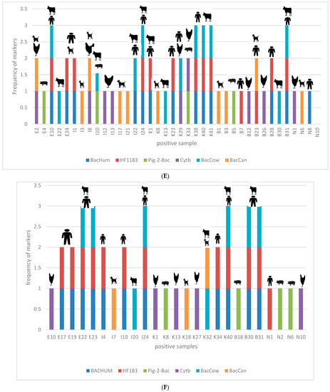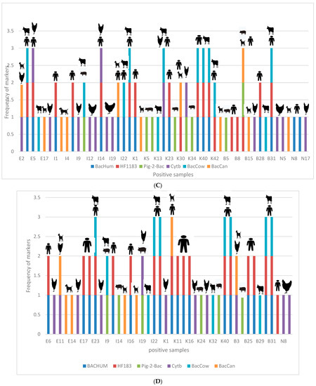 Furthermore, the association between the different enteric pathogens and host-specific markers is indicated in Figure 5A–F. As can be seen in Figure 5A, during the wet season, an association was established between the occurrence of Campylobacter jejuni subsp. jejuni in household-container-stored water and humans. Sample E1 is a sample collected in household-stored water. Dog-specific markers were also detected in the same sample, making dogs a possible source of contamination. In sample B28s, also a household stored water sample, the detected host-specific markers were human markers, suggesting that human faecal materials could be a source of contamination. Furthermore, in samples B30 and B31, both collected in the Luvuvhu River, human- and cow-specific markers were detected, which indicated that either humans or cows could be the source of faecal contamination in the river, further suggesting that the possible source of the Campylobacter jejuni subsp. jejuni detected in those samples may either be from humans or cows. During the dry season, as indicated by Figure 5B, in all the samples in which Campylobacter jejuni subsp. jejuni was detected, humans and cows were also identified as the possible sources of contamination.