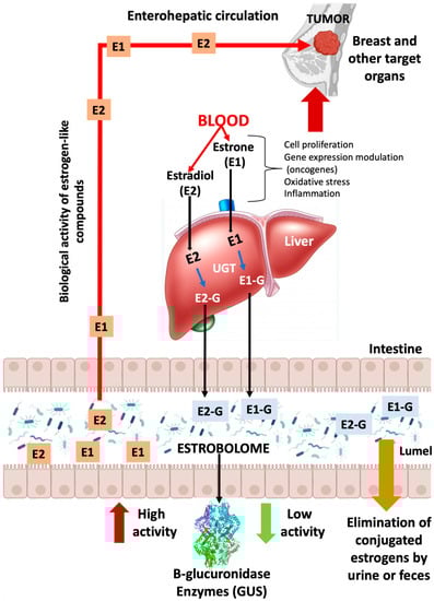 GUS enzymes from the intestinal bacteria that make up the estroboloma release glucuronidated E into the liver via the enzyme UDP-glucuronosyltransferases (UGTs). This reactivation allows E to be recirculated through the portal vein, possibly contributing to hormonal disorders, including breast tumor development. E: estrogen; E-G: glucuronidated estrogen; E1: estrone; E2: estradiol.