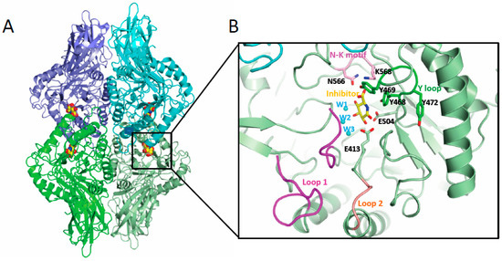 Gut microbial GUS structure. (A) Quaternary architecture of GH2 family GUS. The PDB 3K4D corresponding to EcGUS bound to the glucaro-d-lactam inhibitor is shown. Each dimer is represented in different shades of green and blue and the inhibitor is shown in sphere representation (yellow, red and blue represent carbon, oxygen and nitrogen atoms). (B) Detail of the active center of one of the subunits showing some structural elements involved in conjugated E binding in GUS enzymes including Loop 1 (magenta), Loop 2 (salmon), N-K motif (pink) and Y loop (dark green). Also, those residues and water molecules (in cyan) involved in substrate binding and catalysis are labelled.