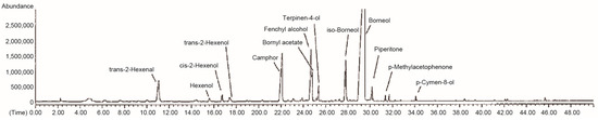 Gas chromatography–mass spectrometry analysis revealed a composition of 84.89% monoterpenoids, 4.67% aldehydes, 2.79% alcohols, 0.04% phenolic compounds, and 7.5% other substances. Borneol, a bicyclic monoterpene, accounted for 55% of the total ASE1 composition (Table 1, Figure 2).