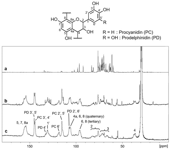 ASE2 contained nonvolatile compounds at 8.4 mg/mL. The yield and polyphenol content of the fractions separated from the nonvolatile compounds are shown in Table 2. H2O eluates were the most abundant fraction and mainly contained fructose and glucose with respect to authentic sugars (Figure S1). The 50% MeOH and 70% acetone eluates were polyphenol-rich fractions. 13C–NMR analyses revealed that 50% MeOH and 70% acetone eluates mainly contained procyanidin- and prodelphinidin-type condensed tannins [29,30] (Figure 3).