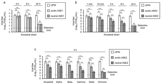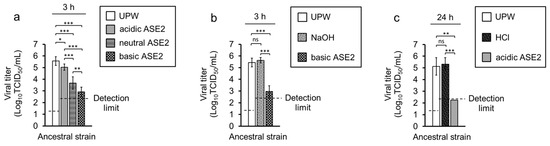Impact of pH on the virucidal activity of ASE2 against SARS-CoV-2. (a–c) SARS-CoV-2 ancestral strain was mixed with nine volumes of UPW, acidic, neutral, or basic ASE2 (a), nine volumes of UPW, NaOH solution (pH 10.0), or basic ASE2 (b), or nine volumes of UPW, HCl solution (pH 2.9), or acidic ASE2 (c). The estimated final pH of the mixtures containing NaOH or basic ASE2 was 8.7; it was 5.1 in the mixtures containing HCl or acidic ASE2. After 3 h (a,b) or 24 h (c) incubation at 25 °C, the viral titer in each mixture was evaluated. The data are expressed as mean ± SD (n = 8 per group). One-way ANOVA followed by Tukey´s multiple comparison test or Kruskal–Wallis test with Dunn’s multiple comparison test was performed to evaluate the statistical significance among four (a) or three (b,c) groups. * p < 0.05; ** p < 0.01; *** p < 0.001; ns: not significant.