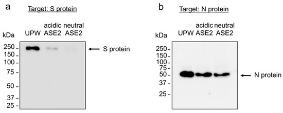 Impact of ASE2 on SARS-CoV-2 structural proteins. (a,b) SARS-CoV-2 ancestral strain was mixed with nine volumes of UPW, acidic, or neutral ASE2. After 24 h incubation at 25 °C, WB targeting the S (a) and N (b) proteins of SARS-CoV-2 was performed. The experiment was repeated six times for the S protein and three times for the N protein.
