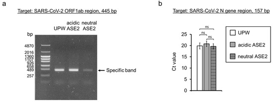 Impact of ASE2 on the SARS-CoV-2 genome. (a,b) SARS-CoV-2 ancestral strain was mixed with nine volumes of UPW, acidic, or neutral ASE2. After 24 h incubation at 25 °C, conventional RT-PCR (a) and real-time RT-PCR (b) were performed. (a) The conventional PCR primer set amplified a 445 bp fragment in the ORF1ab region. Conventional RT-PCR was repeated five times. (b) The real-time PCR primer set amplified a 157 bp fragment in the N gene region. The Ct values are expressed as mean ± SD (n = 4 per group). One-way ANOVA followed by Tukey’s multiple comparison test was performed to evaluate the statistical significance among the three groups. ns: not significant.