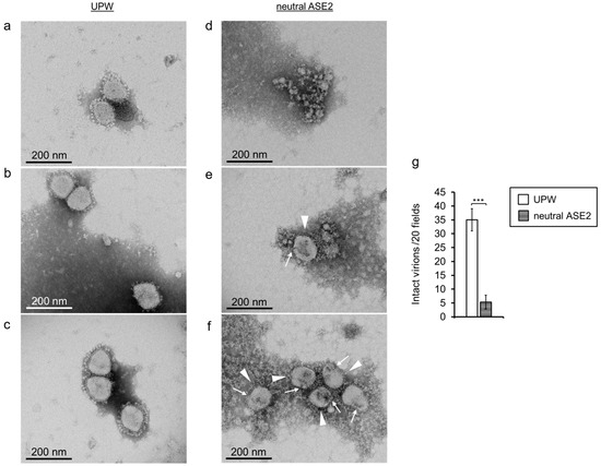 BCoV was used as a surrogate to SARS-CoV-2. BCoV virions were observed using a transmission electron microscope after 6 h incubation with UPW or neutral ASE2. In the UPW group, virions maintained a normal virion structure with clearly discernible S protein and a well-defined, intact envelope (Figure 8a–c). In the virions of the neutral ASE2-treated group, S protein structure was unclear in the majority of virions. Envelope integrity appeared to be disrupted in some areas, with the staining agent having penetrated the virions, which could be observed by the presence of dark spots inside them (Figure 8d–f). Additionally, the number of intact virions observed in the neutral ASE2-treated group was significantly lower than that in the UPW group (Figure 8g).