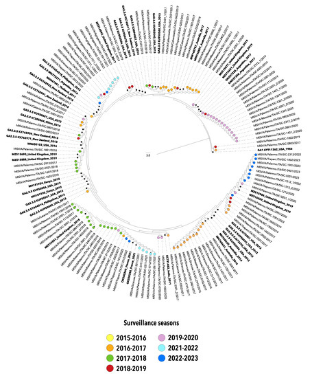 However, it is worth noting that the novel combination of AA mutations, which marked the most recent season 2022–2023, emerged in Sicily for the first time: T80M, E224V, P234L, L247P, G296S, and S311P. To the best of our knowledge, these six signature AA changes have not been described before, except for the single AA substitution G296S that was found in a couple of South Korean genomes collected in 2014–2015 [47] and the three mutations L274P, G296S, and S311P identified in a cluster of Chinese ON-1 strains circulating in late 2021, after a peak of COVID-19 [48]. Nevertheless, it should be considered that very few papers concerning the analysis of genomes of viruses isolated during the 2022–2023 season have been published yet. Thus, the forthcoming reports may help to corroborate the potential role of these panels of mutations in promoting the emergence of viral variants with selective fitness advantage and, thus, global dispersal.
