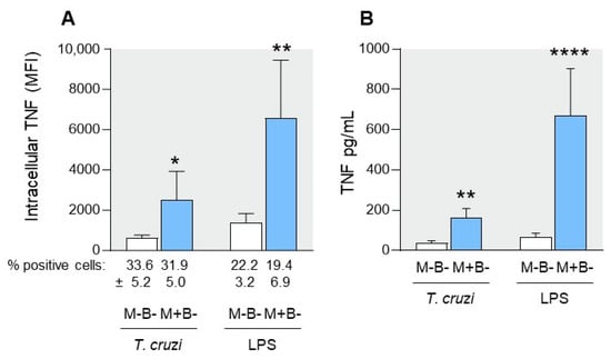 TNF-a expression by monocytes from M+B- and M-B-newborns. (A) Purified cord blood monocytes were cultured for 4 h with a T. cruzi trypomastigote lysate (106 parasites/mL, parasite to cell ratio of 1) or LPS (0.01 µg/mL), in the presence of brefeldin (10 µg/mL). The proportion of TNF-a-positive CD14+ cells and intracellular TNF-a levels (shown as mean fluorescence intensities—MFI) were evaluated by flow cytometry. Results are expressed as mean ± SEM of 9 M-B- and 11 M+B- samples. (B) In other similar experiments in which brefeldin was not added, TNF-a was measured in supernatants by ELISA. Results are expressed as mean ± SEM (n = 11 M-B- samples and 14 M+B- samples). *: p < 0.05, **: p < 0.005, ****: p< 0.0001 vs. M-B- group (Mann–Whitney test).