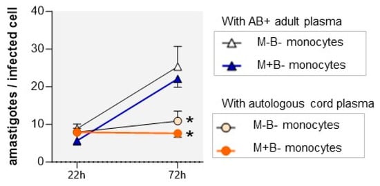 These results highlight two peculiarities of M+B- newborns as compared to the M-B- ones: their monocytes seem to be inherently less permissive to T. cruzi entry of trypomastigotes (cf. when cultured with AB+ adult plasma), while M+B- autologous cord plasma promoted T. cruzi infection of M+B- monocytes.