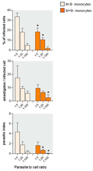 Parasite burden of monocytes from M-B- and M+B- cord blood infected with low doses of T. cruzi trypomastigotes and cultured during 96 h in the presence of autologous cord plasma. After 96 h, cultures were stopped, cells were colored, and we counted the number of infected cells and of intracellular amastigotes per infected cell. The index corresponded to the product of both parameters and evaluates the global parasite burden. Results are expressed as mean ± SEM (n = 5). *: p < 0.05 compared with M-B- monocytes cultured with the same parasite ratio (Mann–Whitney–Wilcoxon test).