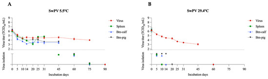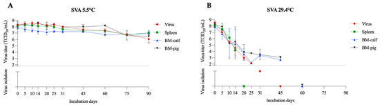SwPV viability in spleen and bone marrow (BM-calf and BM-pig) in decomposing tissues over 90 days. SVA titration and virus isolation results at 5.5 °C (A) and 29.4 °C (B). The dotted line indicates the detection limit of the titration assay (1.8 TCID50/mL). Below the dotted line are presented the virus isolation results, with virus isolation negative samples presented over the X axis.