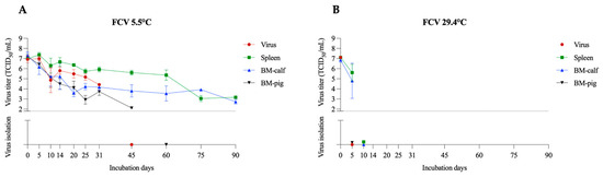 FCV viability in spleen and bone marrow (BM-calf and BM-pig) in decomposing tissues over 90 days. FCV titration and virus isolation results at 5.5 °C (A) and 29.4 °C (B). The dotted line indicates the detection limit of the titration assay (1.8 TCID50/mL). Below the dotted line are presented the virus isolation results, with virus isolation negative samples presented over the X axis.